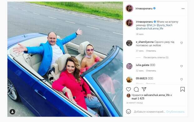 Ирина Сопонару, которая играет в сериале жену Ткача, опубликовала в своем Инстаграм интригующее фото. Актриса позировала в роскошном луке за рулем кабриолета, рядом с ней находилась жена продюсера "Квартал 95", актриса Анна Саливанчук, а на заднем сидении - Юрий Ткач. Кадр получился ярким и позитивным. "Мчим навстречу уик-энду", - написала Ирина. За 20 минут публикация собрала более 1000 лайков и много комментариев. ""Одного разу під Полтавою" это любовь", "