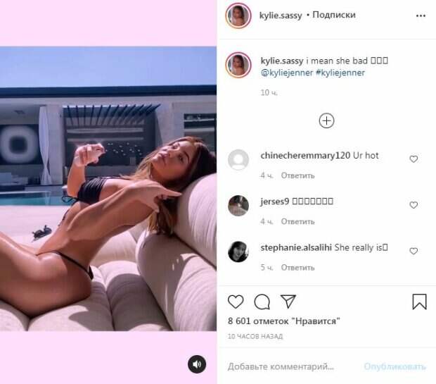 (Чтобы посмотреть на видео, доскролльте до конца страницы). Красотка была в крохотном бикини, которое подчеркнуло ее роскошные объемы. Грудь едва ли не выскальзывала из маленького лифчика, что придавало образу большей интриги и пикантности. Крохотные плавочки оголяли ягодицы, благодаря маленьким лямках, они были практически незаметны на теле жгучей красотки. Раскованная Кайли немного выгнулась на диване и стала демонстративно брызгать себя спреем, вероятно, для загара. Выглядело это очень соблазнительно. "я имею в виду, что она плохая