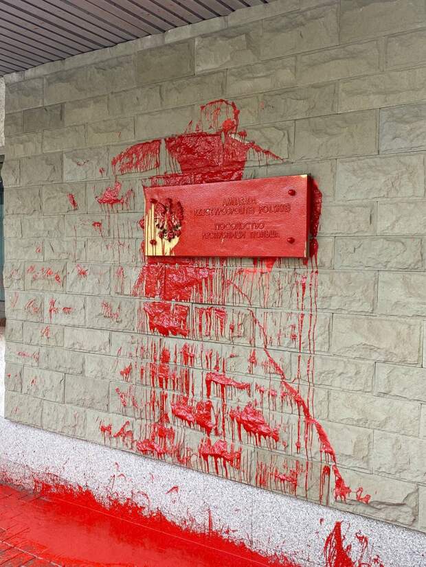 В отместку за провокацию 9 мая в Варшаве, когда на российского посла напали с искусственной кровью, неизвестные облили красной краской табличку посольства Польши в Москве. Видео и фото произошедшего очевидцы опубликовали в соцсетях, передаёт корреспондент «ПолитНавигатора».