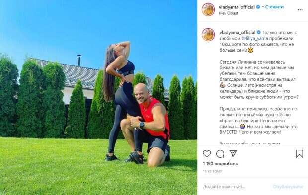 Известный украинский хореограф Влад Яма похвастался спортивными достижениями своей семьи На странице в социальной сети Инстаграм он опубликовал снимок, на котором позирует вместе с супругой Лилианой, передает Politeka.net. Она в спортивных лосинах и топе стоит, изогнувшись назад и демонстрируя идеальную фигуру, а муж держит ее за ногу, присев рядом и улыбается своей фирменной улыбкой.