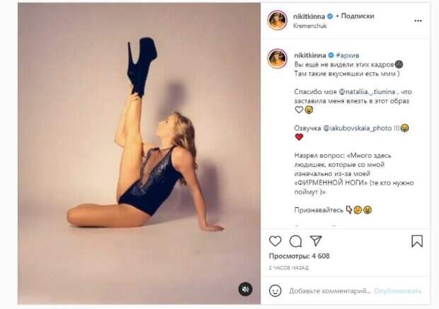 Об этом пишет Politeka.net со ссылкой на страничку знаменитости. "Вы ещё не видели этих кадров. Там такие вкусняшки есть ммм). Назрел вопрос: "Много здесь людишек, которые со мной изначально из-за моей "ФИРМЕННОЙ НОГИ" (те кто нужно поймут)", - написала звезда под фото. Фанаты посмотрели ролик почти 5 тысяч раз и написали комментарии: "Если что, я так могу и двумя, конечно помним", "Не, меня отдельные части тела не интересуют, я за весь комплект", "Бейонсе нервно курит в сторонке", "Жутковатые копытца!", "Вот это 100% уникальная природная красота с такой потрясающей фигурой ног невероятной красоты, вы действительно невероятно красивы". Мы писали, что актриса Екатерина Никитина, звезда "Квартал 95", обескуражила необычным талантом. 24-летняя знаменитость опубликовала в своем микроблоге в Инстаграм свежее видео, на котором продемонстрировала чудеса растяжки во время страстного танца на пилоне. Напомним, блондинка из "Квартал 95" блеснула своими сокровищами в соблазнительном декольте А еще Politeka сообщала, что блондинка из "Квартал 95" в тесных шортиках сложилась пополам, изумив "достоинством", как у Ким Также Politeka писала, что блондинка из "Квартала 95" в развратной одежде показала растяжку возле пилона