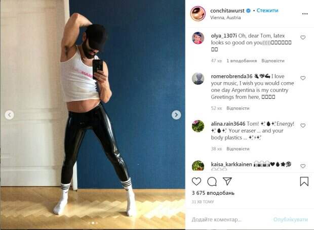 Он активно ведет страницу, и сейчас за его блогом следят уже 396 тысяч фолловеров. Изюминкой новых фото Томаса стали черные латексные черные лосины, которые плотно обтянули его тело. К такому пикантому предмету гардероба артист добавил белые носки, майку, черную кепку и украшение на шее. Нойвирт позировал, изгибаясь и принимая различные позы. Но, вероятно, кадры казались ему не слишком горячими и, чтобы добавить перчинку, артист снял майку. «О, как это круто! Сидит отлично!», «О боже, ты выглядишь эффектно, твое тело проработанное, каждый день, становится все более совершенным, эти позы… Том, ты такой милый, такой замечательный и манящий. Ты очаровательный мужчина, и я люблю тебя», «О, дорогой Том, латекс смотрится так хорошо на тебе», «Ты слишком хорош, и мне стыдно даже говорить о своих мыслях, когда я тебя вижу», - пишут в комментариях. Напомним, как Кончита Вурст вернулась к мини и каблукам, кадры провокации. Как сообщала Politeka, Кончита Вурст в кожаном мини заинтриговала кадром с мускулистым красавчиком. Также Politeka писала, что Кончита Вурст в коротком платье прильнула к мускулистому мачо в латексе.