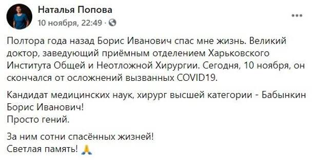 Волонтер Наталья Попова на своей странице в Facebook сообщила, что Борис Бабинкин умер от осложнений, вызванных китайским вирусом. Ранее мы писали, что за сутки в Харьковской области появились новые случаи заражения китайским вирусом По состоянию на 9:00 12 ноября за сутки официально подтвержден 521 случай Covid -19, 11 человек умерло от осложнений вируса , выздоровели 1034. Всего за время пандемии на Харьковщине заразилось 45 469 человек. Из них умерли 616. Выздоровели 13071. Также известно, что в Украине сегодня установлен новый антирекорд - 11057 новых случаев Covid -19 в Украине за сутки: Умерли 9145 (+198 за сутки) Выздоровели 227694 (+6235 за сутки) Болеют 264026 (+4624 за сутки) К слову, харьковчан припугнули "вечным" карантином: в МОЗ дали исчерпывающий ответ. Как сообщала Politeka, харьковчане отреагировали на слова соратников Кернеса, "правду долго будут скрывать". Также Politeka писала, что харьковчане прощаются с родными, которых забрал китайский вирус: "Сложно было смириться с этим".