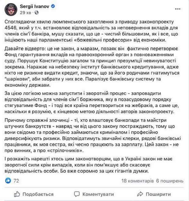 Подвергает опасности институт банковского кредитования, ведь никто не рискнет выдать кредит, зная, что за его родственниками гнаться "шариковы", чтобы забрать у них все. Парализует банковскую систему и экономику государства», - говорится в сообщении. Эксперты называют законопроект неконституционным, в частности вызывает опасения факт предоставления Фонда гарантирования вкладов функций правоохранительных органов. По словам Иванова, это может привести к тому, что ответственность за невозврат кредитов нести даже обычные работники среднего звена и члены их семей. Как следствие, это приведет к тому, что работники банков бояться давать свое согласие на выдачу кредитов, пролонгации и реструктуризации. «Причем настоящие преступники - те, кто устраивает банкопада и мастера искусственных банкротств - вряд ли от этого заново пострадают, потому что они сознательно и профессионально занимаются криминалом и диверсифицируют риски. Отвечать обычные клерки, рядовые банковские работники, как моя сестра, которые честно работают за зарплату. Этот закон - не про виновных, а о «стрелочников», - отмечает Иванов. В частности, есть вероятность, что принятие этого законопроекту свернет развитие программ кредитования в Украине.