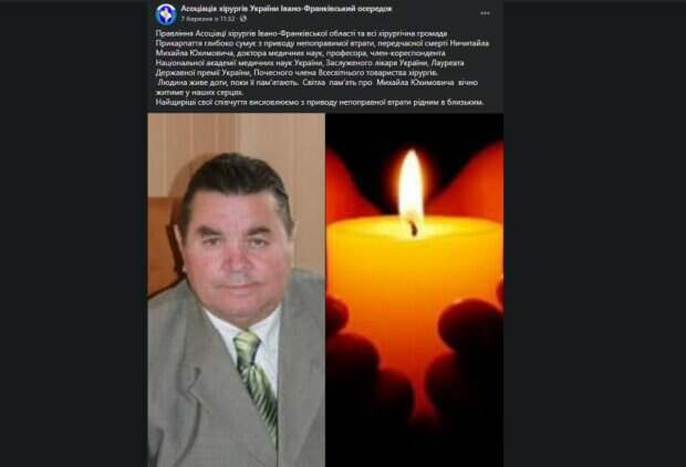 "Правление Асоциации хирургов Ивано-Франковской области и все хирургическая община Прикарпатья глубоко скорбит по поводу непоправимой утраты, преждевременной смерти Ничитайла Михаила Ефимовича, доктора медицинских наук, профессора, член-корреспондента Национальной академии медицинских наук Украины, Заслуженного врача Украины, Лауреата Государственной премии Украины, Почетного члена Всемирного общества хирургов", - говорится в сообщении. На медицинском портале, где предоставлена информация о медике, украинцы благодарили Михаила Ефимовича за проделанную работу. "Врач высшей категории не на словах, а на деле. Самое главное учит молодых врачей, передает свой богатейший опыт", "Хирург от Бога. Человек с большой буквы", "Спасибо, за сохраненные жизни!", "7 марта Михаил Ефимович умер. Царство небесное и светлая память этому достойному Человеку. Скорбим", - писали украинцы в сети. Напомним, украинцам вернут жесткие правила карантина, срочное заявление МОЗ: "В течение трех дней..." Как сообщала Politeka, коронавирус взялся за Прикарпатье с новой силой, люди умоляют о помощи: что происходит в больницах Также Politeka писала, что украинские медики назвали новые симптомы китайского вируса: "Он адаптируется и мутирует".