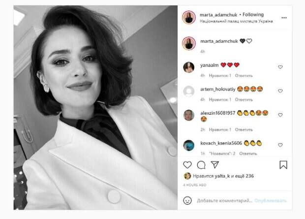 Девушка еще ведет страничку в социальной сети Инстаграм, где делится всем интересным. На новом фото девушка показалась в стильном белом пиджаке. Адамчук стояла в гримерке, делая селфи на телефон. Образ звезда дополнила ярким мейкапом, а фото оставила в черно-белых цветах. Как можно понять, снимок был сделан в Национальном палаце искусств Украина. Красотка туда пришла с другими певицами "Квартала", чтобы исполнить гимн Украины. Остальные девушки тоже выбрали белые наряды для вечера. Напомним, что красотки из «Женского квартала» поразили видом в белоснежных нарядах Также Politeka сообщала, что брюнетка из "Женского квартала" в шляпе и удивительных штанах поразила сменой имиджа А еще Politeka писала, что брюнетка из «Женского Квартала» очаровала видом в роскошном платье с глубоким вырезом на спине