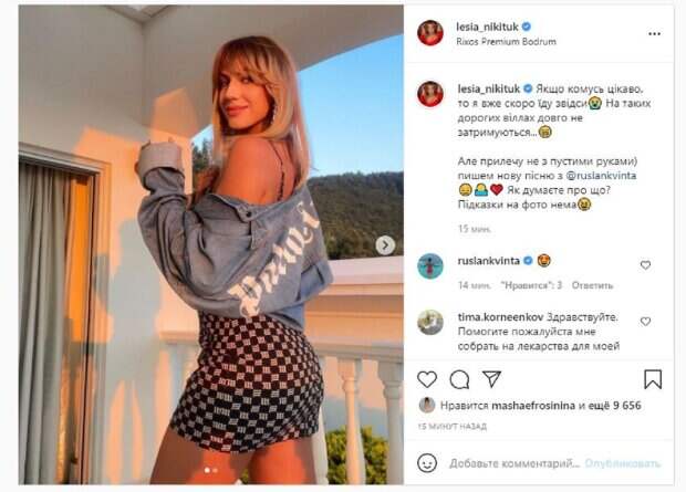 Этот раз не стал исключением, ведь Никитюк показалась в платье и кофточке, которую спустила с плеч. Красотка на одном фото развернулась спиной, демонстрируя подтянутые ягодицы. "Если кому интересно, то я уже скоро уеду. На таких дорогих виллах долго не задерживаются ... Но прилечу не с пустыми руками) пишем новую песню. Как думаете о чем? Подсказки на фото нет", - написала Леся. Фанаты поставили почти 10 тысяч лайков, включая Ефросинину, и написали комментарии: "Шикарная", "И про что песня? О Лесе?", "О лете", "У Леси в комментариях можно найти и работу и заняться благотворительностью. Лучше чем газета", "Девушка - мечта! очень красивая", "Очередной хитяра - 100%! мы все уже в предвкушении))) ну песня о Лесе - это однозначно". Напомним, Никитюк в купальнике оконфузилась, попытавшись красиво прыгнуть в бассейн А еще Politeka писала, что сгоревшая на солнце Никитюк в крошечном бикини поразила видом у бассейна Также Politeka сообщала, что Никитюк в банном халате без смущения похвалилась своей красотой в ванной
