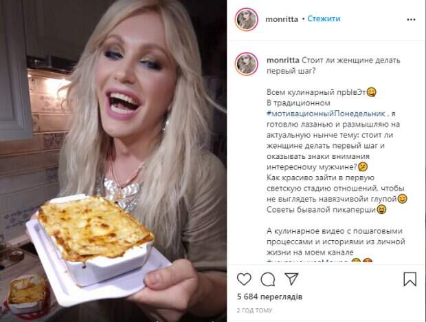 Во время процесса эпатажная звезда затронула щепетильную тему отношений между мужчинами и женщинами, дав несколько советов благодарным поклонницам. "Стоит ли женщине делать первый шаг? Всем кулинарный прЫвЭт😋 Я готовлю лазанью и размышляю на актуальную нынче тему: стоит ли женщине делать первый шаг и оказывать знаки внимания интересному мужчине?🤔 Как красиво зайти в первую светскую стадию отношений, чтобы не выглядеть навязчивой и глупой😊 Советы бывалой пикаперши😆", - говорится в сообщении. Пользователи с жаром кинулись обсуждать увиденное и услышанное: "Класс😂👍Как всегда искрометно и с юмором😍" "Отлично! Если Вам уже немного за тридцать, есть надежда выйти замуж за принца! 😂😂😂 Про помощь правда, мужчины любят помогать (настоящие мужчины), особенно если девушка им нравится!" "Правильные советы👍 Сами лупили в школе мальчишек а теперь хотим от них инициативы😁 А теперь надо дать им понять что мы не против инициативы))" "Крошка, ты похожа на Бритни в ее лучшие годы!😍" Ранее мы сообщали, Монро изумила архивным снимком, предавшись приятным воспоминаниям. На фото она стоит в блестящем наряде, прикрыв пикантное место букетом роз. Травести-дива объявила, что в сентябре будет отмечать 21 год своей карьерной деятельности и анонсировала много тематических кадров, архивных фото и веселых историй. Одну из них, которая произошла в 2017 году во Львове во время загородной вечеринки по случаю 8 марта, звезда рассказала в микроблоге. "Как всегда, сначала испуг и легкое недоумение у мужчин, и детский восторг у женщин. Спустя пол часа, восторг у всех 🤗😍 и очередь "а можно фото?" Можно и нужно!", - поделилась воспоминаниями знаменитость. Напомним, что травести-дива Монро осталась без одежды и показала себя, как есть: «Ух, жарче стало». Как сообщала Politeka, травести-дива Монро взбудоражила локонами страсти: «Ну прям Афродита». Также Politeka писала, что травести-дива Монро удивила смелым образом без белья: "Сначала подумала, что это Бузова".