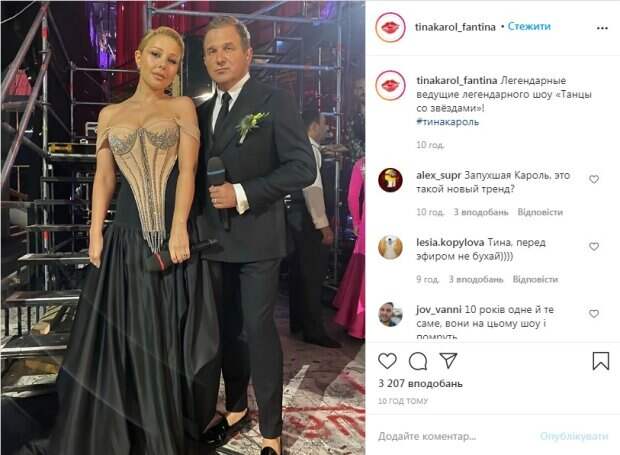 Черное одеяние украшали блестящие вставки со стразами. Волосы артистки были собраны, макияж подчеркивает глаза. При этом некоторым зрителям показалось, что в этот раз Тина Кароль выглядела не очень хорошо. В частности обратили внимание, что она выглядела опухшей. «Запухшая Кароль, это такой новый тренд?», «Тина, перед эфиром не бухай», пишу в Сети. В то же время другим образ Тины очень понравился. «Королева», «Красотка, как всегда», «Супер», «Тина шикарна, красивая