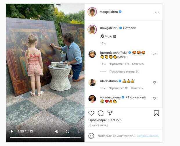 В этот раз Галкин решил показать, как моет потолок. "Это так называемый плафон — вид архитектурного сооружения снизу, когда художник рисует обманку на потолке. Плафон состоит из четырех холстов, он старый, ему 150 лет", - рассказал о потолке Галкин. Для того, чтобы помыть эти части, Максиму пришлось использовать вату и мыльную воду, а также обычную. Пока сын Гарри снимал, Галкин протирал огромные холсты. После этого Максим показал супругу Аллу, которая сидела в домашней одежде в удобном кресле. "Ты меня снимаешь?", - спросила Алла. Напомним, дочь Пугачевой и Галкина удивила внешностью в стильном образе на прогулке Также Politeka сообщала, что Галкин решил "похозяйничать" и заставил женщин завидовать Пугачевой А еще Politeka писала, что муж Пугачевой Галкин с сыном показал прелести жизни в деревне, красноречивые кадры