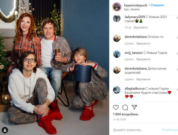 Актер «Квартал 95» Степан Казанин (настоящее имя – Сергей) порадовал поклонников семейным снимком Как пишет Politeka.net, у себя в Инстаграм 46-летний комик опубликовал праздничное новогоднее фото с семьей. Степан сидел на стуле в джинсах и клетчатом бомбере. В руках у него был бокал. Рядом с главой семейства сидела его рыжеволосая жена, дизайнер Наталия Казанина, и два сына – Степан и Петр.