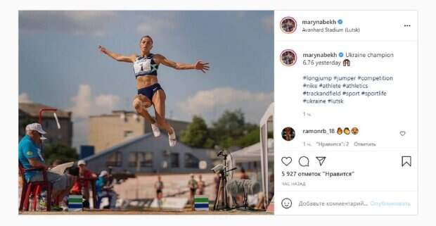 Красотка стала чемпионкой Украины на прыжки в длину, прыгнув на 6.76 метра. На фото, которое опубликовала Марина в Инстаграм, Бех можно увидеть в момент полета. Красотка была в спортивном мини, летя в воздухе. Мышцы у Марины были напряжены, поэтому можно оценить рельефную фигуру красотки. "Чемпион Украины 6.76 вчера", - написала Марина. Фанаты поставили более 5 тысяч лайков и написали комментарии: "Хорошо, первая. Лети как птица", "Я верю, что умею летать", "Поздравляю!", "Поздравляю и какое фантастическое фото", "Я желаю вам успехов всегда и во всем !!! Счастье!". Сообщалось, что известная украинская легкоатлетка Марина Бех-Романчук очачовала внешним видом во время поездки за границу. Красотка надела короткий белый спортивный топ, от известного бренда, который вволю дал насладиться мускулистым телом легкоатлетки, а также тугие лосины лавандового цвета. Напомним, украинская чемпионка Бех-Романчук показала идеальное тело в работе во время соревнований А еще Politeka писала, что украинская чемпионка Бех-Романчук блеснула аппетитными формами в тесных шортах Также Politeka сообщала, что украинская чемпионка Бех-Романчук сверкнула мягким местом в коротеньких шортах