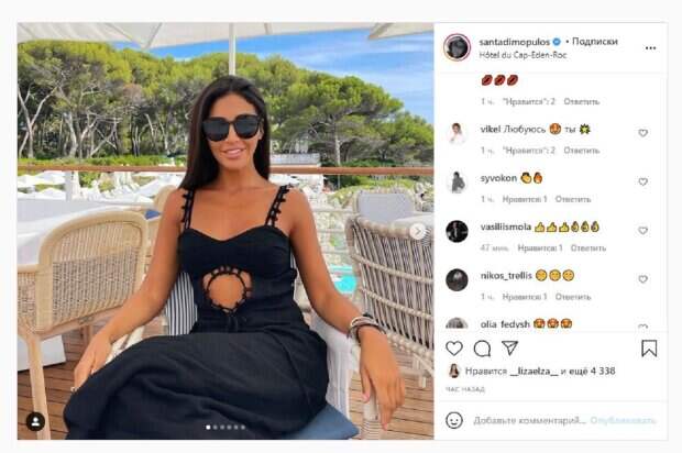 На новых фото Санта показалась в платье с вырезом на животе. Красотка была в очках, а на руках можно увидеть браслеты. Димопулос, как можно понять, отдыхала на побережье Франции, в 15 км от Канн. Девушка на нескольких фото показала, как хорошо провела время. На еще одном снимке красотка была с подружкой и другом. "Одно из самых красивых и волшебных мест! Всегда возвращаюсь сюда", - написала Санта. Фанаты поставили более 4 тысяч лайков и написали комментарии: "Super Star's, девочки, вы прекрасны", "Красивый сарафан у вас", "Полностью согласна, это не отель-это место мечта". Напомним, Димопулос из «Танців з зірками» похвасталась роскошным отдыхом в платье с пикантным вырезом А еще Politeka сообщала, что победительницу "Танців з зірками" Димопулос спутали со звездой "Отчаянных домохозяек" Также Politeka писала, что победительница "Танців з зірками" Димопулос жестко высказалась о своих гулянках без мужа