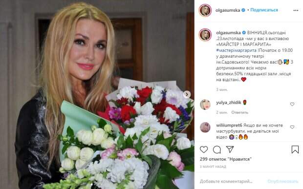 На других кадрах Сумская показала яркие моменты своего выступления на сцене. На одном из снимков артистка встала на колени позади молодого актера, склонив над ним голову и положив руки на плечи. "Винница, сегодня, 23 ноября мы у вас со спектаклем «МАСТЕР И МАРГАРИТА». Начало в 19.00 в драматическом театре Садовского! Ждем вас! ✋