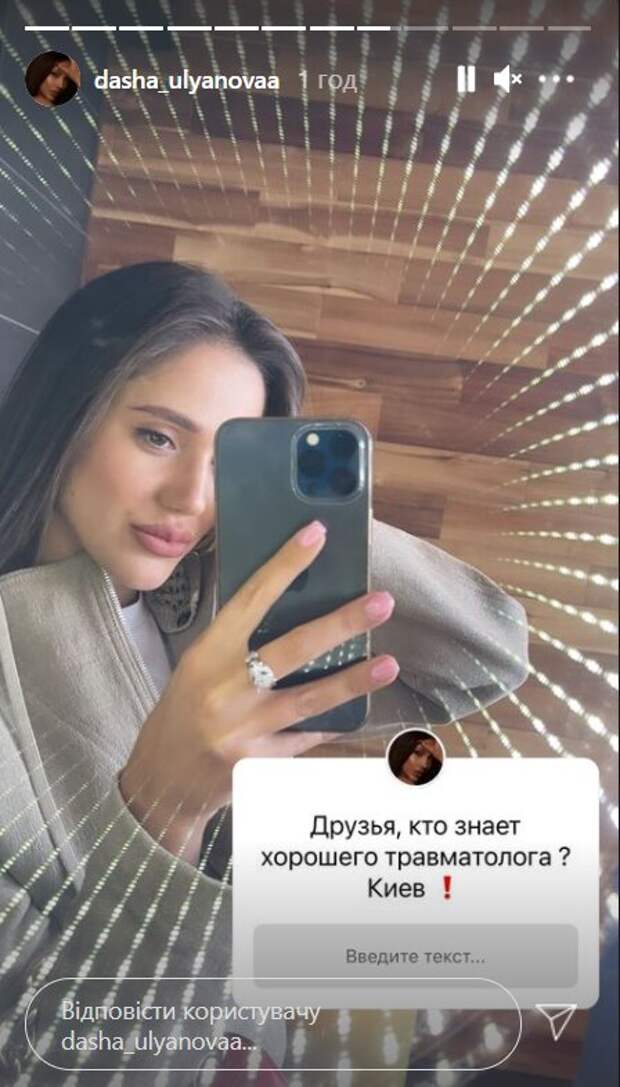 В этот раз Даша в социальной сети опубликовала фото, на котором она делает селфи. Ульянова спросила фолловеров, кто знает хорошего травматолога в Киеве. А в следующей сториз обьяснила, что ее мучают сильные боли. "Шея болит нереально. Старость подкралась незаметно. Если у вас есть хороший знакомый врач - напишите мне пожалуйста", - написала Даша Ульянова. По словам красотки, ей 24 года и она уже полностью на себе ощущает последствия гимнастической жизни. "Для гимнастки я уже бабушка", - написал Ульянова. "Стоит мне что-то сделать без разминки, у меня начинают болеть суставы, на сегодняшний день это шея. На самом деле смешно, потому что раньше если меня что-то болело, то проходило за полдня и я дальше чувствовала себя гибкой, красивой. То сегодня шея болит уже неделю", - призналась Ульянова, что даже больно голову поднять. На следующих видео девушка показала фото шпагата, которое сделала без предварительной разминки, что и спровоцировало болезненность шеи. Напомним, победительница "Холостяка" Ульянова хвастнула перед украинцами своими изысками: "Идеальное воскресенье" Также Politeka сообщала, что победительница "Холостяка" Ульянова в мокром бикини показала райские места А еще Politeka писала, что Ульянова из "Холостяка" в крошечном бикини хвастнула шикарной растяжкой