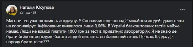 Волонтер и блогер Наталья Юсупова возмутилась количеством бесплатных тестов на вирус в Украине Как передает Politeka.net, недовольство на своей страничке в Facebook. В пример она привела Словакию, где проводят массовое тестирование. "В Словакии еще более 2 миллионов человек сдали тесты на коронавирус.