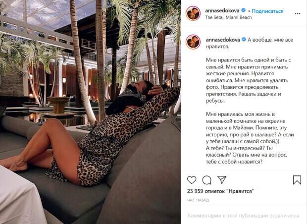 Нравится ошибаться. Мне нравится удалять фото. Нравится преодолевать препятствия. Решать задачки и ребусы. Мне нравилась моя жизнь в маленькой комнатке на окраине города и в Майами. Помните, эту историю, про рай в шалаше? А если у тебя шалаш с самой собой», - написала звезда. Свои размышления она сопроводила кадром, на котором отдыхает в роскошном отеле в Майами. Звезда раскинулась на диване в «хищном» платье с леопардовым принтом. При этом и без того короткая юбка наряда сильно задралась вверх, демонстрируя загорелые ножки певицы. Свой нос и рот Седокова закрыла черным платком, который она дерзко повязала на свое лицо. Поклонники звезды активно комментируют ее пост. «Ты прекрасна», «Эта фотка круче)», «Тигрица», «оч классные ножки», «Анна! У вас такие аппетитные формы) я ни на что не намекаю, просто приятно посмотреть», «Кого-то соблазняет?», «Анечка ваши ГЛАЗА нам нравятся хоть в парной ипостаси, хоть в трех инсинуациях. Хоть в шалаше», - пишут люди. Напомним, бесстыжая Седокова в кружевном лифчике показала формы на публике. Как сообщала Politeka, раздетая Седокова посветила прелестями в шальном образе Красной шапочки: "Ждет своего волка". Также Politeka писала, что игривая Седокова в соблазнительном купальнике изогнулась и показала наслаждение.