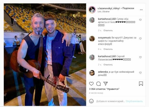 Победитель на шоу "Голос країни" Лазановский поделился соответствующим кадром в сети. Бабкин обнял коллегу за плечи и оба улыбнулись. ""Однажды во Львове на @ukrsongproject ❤️ Встретились себе два Сергея