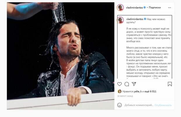 В новом посте артист, который недавно стал пробовать себя в стендапе, рассказал, какой был его отец. По словам певца, у его отца было хорошее чувство юмора. "В моем детстве папа тянул один прикол на протяжении нескольких лет - фокус. Он подзывал меня, просил выбрать и запомнить любую карту, мешал колоду, открывал на середине, показывал и говорил: «Это не она!». Складывал карты ииии ВСЁ!", - поделился артист. Владимир Дантес рассказал, что для него было тяжело удалять номер отца из телефонной книжки, поэтому однажды он получил сообщение "с того света". "Самое ужасное - когда приходит уведомление: «теперь папа в Вайбере! Отправьте ему открытку»