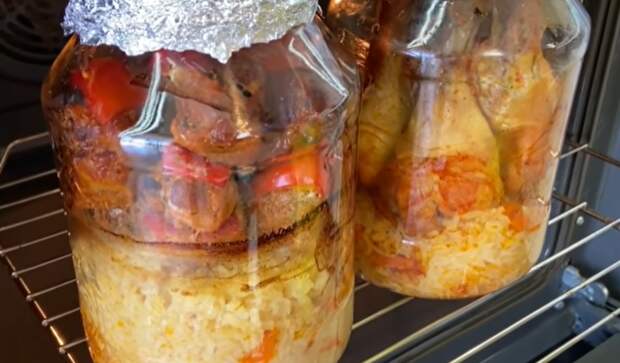Мясо надо подготовить заранее - пусть помаринуется 2-3 часа, чем дольше, тем лучше. А если времени мало, то хоть 30 минут надо. Что понадобится (на две банки по 1,5 или 2 л), получится 4 порции: 350 г свинной шеи; 4 куриные ножки; стакан риса; стакан воды; 1 сладкий красный перец; 1 морковь; 2 зубка чеснока; 1 ч.л. соли; 1 ч.л. сладкой паприки; 1 ч.л. сухих трав; 2 ст.л. лимонного сока; 2 ст.л. подсолнечного масла; соль и перец. [caption id="attachment_46474" align="aligncenter" width="780"] Ингредиенты для готовки[/caption] Приготовление Мясо заранее посыпать паприкой, посолить, поперчить, добавить травы, лимонный сок, натертую на крупной терке луковицу и хорошо перемешать.[caption id="attachment_46462" align="aligncenter" width="860"] Мясо надо подготовить заранее[/caption]Через 2 часа мясо готово.[caption id="attachment_46464" align="aligncenter" width="850"] Замаринованное мясо для блюда[/caption]Подготовим рис. Его надо многократно промыть, пока слив не станет полностью прозрачным. Далее залить стаканом воды, добавить 1 ч.л. соли и под крышкой варить 3 минуты после закипания. Оставить на 5 минут, пусть вся вода впитается. После этого откинуть его на дуршлаг и промыть теплой водой. [caption id="attachment_46466" align="aligncenter" width="679"] Сваренный до полуготовности рис[/caption]Пока рис варится, очищенную морковь порезать на соломку и несколько минут обжарить на подсолнечном масле вместе с чесноком (его лучше потом вынуть). К моркови добавить рис, перемешать и все поместить на дно банок, разделив поровну.Мясо и куриные ножки надо нанизать на бамбуковые палочки, перемежая с кусочками болгарского перца. Слишком длинные палочки укоротить по размеру банки.[caption id="attachment_46478" align="aligncenter" width="607"] Свинина и перец на палочках[/caption]Поместить мясо на шампурах вертикально в банки.[caption id="attachment_46480" align="aligncenter" width="708"] Мясо в банках с рисом[/caption]Банки накрыть фольгой и отправить в холодную духовку. Запекать 1 час 10 минут при температуре 180 С.[caption id="attachment_46468" align="aligncenter" width="592"] Запекание в духовке[/caption]Потом оставить еще на 30 минут, немного приоткрыв дверцу - мясо будет томиться, как в печи.[caption id="attachment_46470" align="aligncenter" width="659"] Блюдо готово[/caption]Можно подавать! Приятного аппетита[caption id="attachment_46472" align="aligncenter" width="743"] Мясо с рисом из банки[/caption]