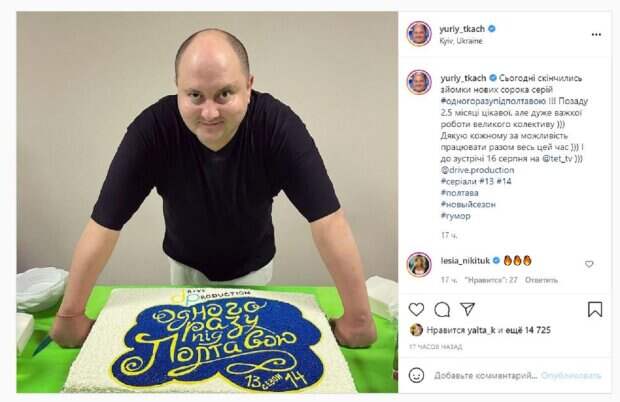 На новом кадре Юрий позировал в футболке и штанах. Мужчина наклонился над большим тортом с надписью. "Сегодня закончились съемки новых сорока серий #одногоразупідполтавою !!! Позади 2,5 месяца интересной, но очень тяжелой работы большого коллектива))) Спасибо каждому за возможность работать вместе все это время)", - написал Юрий. Фанаты поставили 14 тысяч лайков и написали комментарии: "Ждём 16 августа, с нетерпением", "Жду не дождусь", "Вы все большие молодцы", "Очень круто (мне понравилось)) молодцы", "Ждем новых серий". Напомним, Ткач из «Квартал 95» показал неожиданный талант маленькой дочки, видео А еще Politeka сообщала, что резко постаревшего Ткача из "Квартал 95" с новой прической не узнали в Сети Также Politeka писала, что Кравец из "Квартал 95" показала Юрия Ткача в неожиданном свете