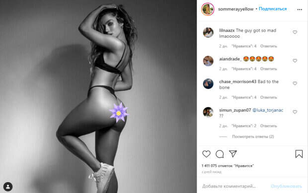 На представленном фото девушка позировала в черном белье довольно минималистичного, но весьма открытого дизайна. Рей показала при этом подкачанные ягодицы и повернулась спиной к камере, скрыв бюст. Дело в том, что Соммер не любит показывать грудь из-за того, что ее часто высмеивали в подростковом возрасте. У девушки нулевой размер груди и поэтому фитнес-модель привыкла делать акцент именно на ягодицах «как у Ким». Вот как реагируют на черно-белый кадр поклонники: «Они стали больше; одна романтика и только