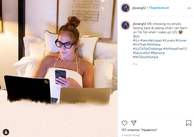 Артистка замоталась в белую простыню, из-под которой были видны тоненькие лямки нижнего белья, собрала на скорую руку волосы в пучок и водрузила на нос очки в толстой темной оправе. Лопес напряженно что-то рассматривала на экране одного из ноутов. "Я: проверяю электронную почту, отвечаю на сообщения и вижу, что я могу узнать в Tik Tok, когда проснусь! LOL