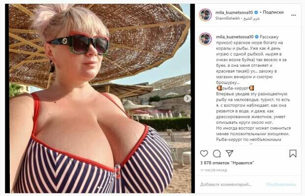Об этом пишет Politeka.net со ссылкой на страничку знаменитости. "Расскажу прикол) красное море богато на кораллы и рыбы. Уже как 4 день играю с одной рыбкой, ныряя в очках возле буйка) так весело я за буек, а она меня отгоняет и красивая такая)) ух... захожу в магазин вечером и смотрю брошюру... рыба-хирург", - написала Мила. Фанаты поставили более 3 тысяч лайков и написали комментарии: "Прекрасно", "Ты как всегда просто непревзойденно выглядишь", "Gorgeous", "Хм! Странно что Вы не знали об этом. Я ещё в детстве в советской энциклопедии про эту рыбу читал", "Ого, не знала,что есть такие опасные, но на вид милые, рыбки", "Ух, ты" Сообщалось, что известная модель Мила Кузнецова показала себя в необычном образе, похваставшись отдыхом. На фото красавица позировала в полосатом купальнике, демонстрируя себя довольно близко. Образ Мила дополнила стильными очками, а волосы собрала в хвост. Напомним, украинка с 13-м размером покорила огромным бюстом в смелом бикини А еще Politeka сообщала, что украинка с 13-м размером обтянула бюст веревочками, эффектный ракурс Также Politeka писала, что украинка с 13-м размером похвасталась богатством в экстремальном купальнике