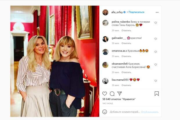 На опубликованном кадре Пугачева предстала в полосатых брюках и кофте, которая оголила ее плечи. Образ певицы вызвал бурные обсуждения в сети. Поклонники восхитились новой прической Аллы Борисовны в комментариях под постом. Некоторые также подметили, что в подписи к снимку Пугачева процитировала слова из песни Тины Кароль. "Алла Борисовна, выглядите великолепно! Здоровья Вам крепкого!", "Ой, какие дамы красивые, просто шик!", "Обалдеть от Аллы Борисовны, неиссякаемый идеал для меня", "Ровные волосы вас красят и омоложают !! Супер Вам!", "Ого концовка фраза это с песни Тины Кароль кстати)", "Вижу в почерке слова Тины Кароль", "Прическа просто класс, вам очень идет", "Как приятно, что Вам нравится творчество Тины Кароль))", - писали под постом Пугачевой. Напомним, что улыбчивая Пугачева перестаралась с пластикой, от морщин не осталось и следа: "Начинается весна". Как сообщала Politeka, Алла Пугачева в мини-юбке призывно подвигала бедрами, Галкин и Киркоров в ауте: "Учитесь, тетки". Также Politeka писала, что Алла Пугачева неожиданно показала свое настоящее лицо без ретуши и фильтров: "Хоть на себя немного похожа".