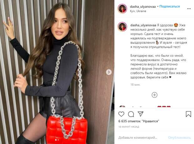 Привлекательный лук дополнила стильная красная сумочка с цепью вместо ручки. В подписи Ульянова объявила о полном выздоровлении - как известно, ранее экс-участница "Холостяка" подхватила китайский вирус. "Я здорова
