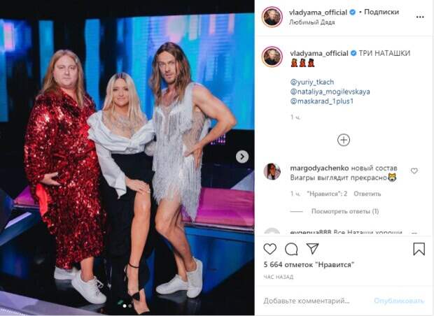 Как передает Politeka.net, Яма опубликовал в своем микроблоге в Инстаграм забавное фото с Ткачом и настоящей Могилевской: все трое предстали в роскошных платьях. Юморист продемонстрировал "формы" в красном блестящем нарядя, натянув парик с золотистыми локонами. А хореограф-"шатенка" вскружил голову дерзким мини-платьем с бахромой серого цвета, усыпанным камнями. Певица очаровала черно-белым нарядом и безумно красивым разрезом аж до бедра. "Три Наташки
