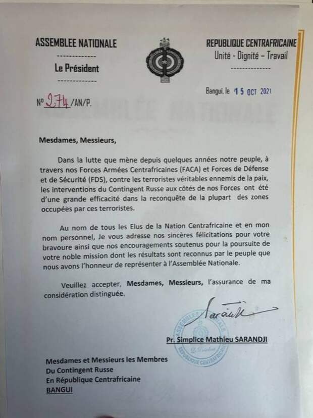 В парламенте Центральноафриканской Республики состоялась церемония награждения главы российских инструкторов Александра Иванова. Документ с благодарностью лично вручил спикер Национальной ассамблеи Симплис Матье Саранджи. Он рассказал о борьбе, которую ведут народ ЦАР, вооруженные силы страны и другие органы безопасности совместно с российским контингентом и подчеркнул, что благодаря инструкторам республика смогла справиться с террористами и освободить большую часть захваченных боевиками районов.