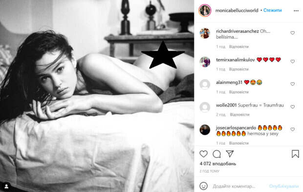 Ее пышные формы и элегантная красота будоражит фантазию мужчин, которые готовы совершать ради нее безумства. На одной из фан-страниц в Инстаграм опубликовали архивный кадр, на котором очень молодая Беллуччи позировала без одежды. Красотка разлеглась на кровати, прикрывшись простынями, однако часть ее аппетитного тела все же попала в кадр. В комментариях поклонники оставили актрисе массу приятных слов. «Богиня любви», «Моника навсегда», «Лучший вид», «Так горячо», «Самая шикарная женщина на Земле», «Волшебный вид», «Дикая кошечка», «ты прекрасна», - пишут пользователи сети. Ранее мы писали, что Моника позировала в атласном наряде с глубоким декольте. Она решилась на смелый эксперимент с волосами, сделав себе афро-накрутку. Массивное ожерелье украсило шею актрисы, привлекая внимание к зоне декольте. Напомним, что пышногрудая Моника Беллуччи впечатлила видом с афрокудрями и в атласном наряде: "Не для простых смертных". А еще Politeka писала, что страстная Моника Беллуччи побаловала видом лакомств в тесном корсете: «Божество». Также Politeka сообщала, что страстная Моника Беллуччи сжала бюст, позволив налюбоваться пышными прелестями: «Лучший вид».
