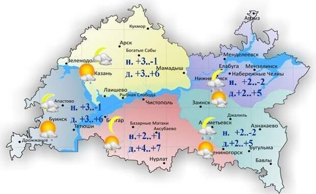 Максимальная температура воздуха днем составит +2.. +7 градусов. В Казани ожидается от +3 до +6 градусов. В Набережных Челнах синоптики прогнозируют от +2 до +5 градусов.