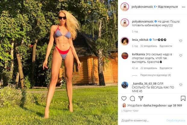 Полякова засветила стройные ножки, плоский животик, на котором виден пресс, а также пышную грудь. Особое внимание поклонников привлекли неописуемой длины ножки артистки. «На даче! Пошла готовить кабачковую икру!))», - игриво подписала пост артистка. За час ее фото собрало более 40 тысяч лайков. Оценила фото и Леся Никитюк. В комментариях ей оставили массу приятных слов. «Похожа на куклу Барби», «Это сколько надо в спортзал ходить, чтоб так выглядеть. Красотка», «Бачу кабачки вродили!», «С таким-то поваром у мужа наверное все время голод)))», «Следите, чтобы «икра» не подгорела», «Крутая», «Богиня», - пишут пользователи сети. Стоит отметить, что после смягчения карантина Полякова стала намного реже публиковать фото в Инстаграме, хотя во время карантина она была одной из самых активных звезд в сети. Певица ежедневно проводила несколько прямых эфиров с приглашенными звездами. Напомним, что Полякова без капли стыда задрала мини-юбку и показала, чем сводит с ума мужчин: «Тигрица винницкая». Как сообщала Politeka, Полякова и Кароль померились "мячиками" в декольте, горячие кадры: "Тут и дураку понятно...". Также Politeka писала, что беда случилась с Олей Поляковой прямо на сцене, срочно прибыли медики: все подробности.