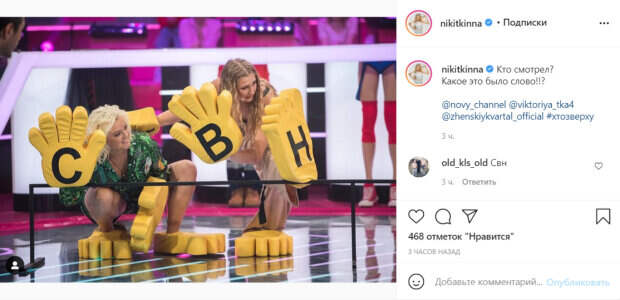 Стоит отметить, что девушка с самого детства занимается танцами и теперь помогает другим обучиться этому. Екатерина активно ведет социальные сети и делится с поклонниками моментами из жизни. На этот раз Екатерина поделилась новым фото на своей странице в Инстаграм. На снимке у актрисы огромные руки и ступни с буквами, и она пытается вместе со своей напарницей Викторией Ткач сложить слово. Как известно, такой конкурс проходит на шоу "Хто зверху", ведущими которого являются Сергей Притула и Леся Никитюк. "Кто смотрел? Какое это было слово!!?", спросила Екатерина Никитина. Поклонники девушки оставили несколько комментариев, где пытаются угадать слово: "Я смотрела, классный выпуск. Слово наверное - свинка", "Свинка", "Совеня", "Я смотрел". Ранее сообщалось, блондинка из "Женского квартала" насмешила видом, сползая по стеклу: "Хочешь, я буду той самой..." Также, блондинка из "Женского квартала" Никитина в узком топике залюбовала стильным образом: "Меньше пафоса" Politeka рассказывала, голубоглазая блондинка из "Женского квартала" расплылась в улыбке и обратилась к украинцам: "Это наше главное оружие"