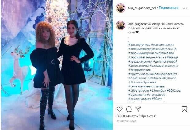 Новый имидж Аллы Пугачевой вызывает неоднозначную реакцию у фанатов Свежий снимок с примадонной появился на фанатском аккаунте в Instagram. На фото довольная Алла Пугачева в соблазнительном платье и лаковых ботфортах, видимо, пытается похвастаться стройными ножками. "Не надо мстить подлым людям, жизнь их накажет сама", - говорится в подписи к снимку, на котором Алла Пугачева позирует в компании певицы Жасмин.