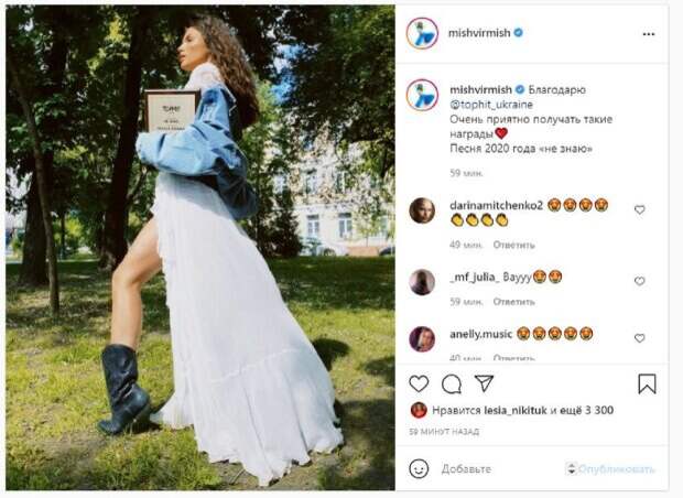 Так, в Инстаграм, Мишель опубликовала фото, на котором позировала в белом платье. Девушка набросила сверку джинсовую куртку, а образ дополнила стильными сапогами. Андраде стояла на газоне, выставив одну ножку, а в руке держала награду. "Благодарю Топ-хит Украины. Очень приятно получать такие награды Песня 2020 года "не знаю", - написала Мишель под кадром. Фанаты поставили тысячи лайков и написали комментарии: "Класс, поздравляю", "Поздравляем", "Поздравляю, надеюсь это не одна такая награда в твоей жизни", "Вау", "Вы талантливая певица и красивая девушка Мишель Андраде!", "Заслужила!" Сообщалось, что известная украинская певица Мишель Андраде показала себя, поделившись радостью. В этот раз Мишель опубликовала фото, на котором позировала цветочном платье с кроем "для беременных". Красотка улыбалась, позируя на фоне древних колонн. Напомним, подопечная Потапа Андраде объявила о переменах в жизни, о которых молчал А еще Politeka сообщала, что экс-бойфренд Андраде и звезда «Голосу країни» Ломакин засветился в объятиях Дорофеевой Также Politeka писала, что подопечная Потапа Андраде перешла на украинский и впечатлила новым образом