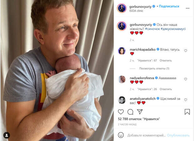В том же году у них родился сын Иван, которому сейчас 4 года. Как известно, вчера у пары родился еще один сын. Супруги активно ведут социальные сети и делятся с поклонниками моментами из жизни. На этот раз Юрий опубликовал новое фото на своей странице в Инстаграм. На снимке телеведущий показывает себя на руках с новорожденным малышем. "Вот он - наша нежность", рассказал шоумен. Поклонники засыпали Юрия и сына приятными словами в комментариях. К поздравлениям присоединились такие знаменитости как: Леся Никитюк, Даша Астафьева, Надя Дорофеева, Дзидзьо, Сергей Бабкин и Маричка Падалко. Ранее сообщалось, Потап и Горбунов кардинально сменили имидж ради съемок: "Николаев пластику сделал по омоложению" Также, Горбунов в роддоме поразил первыми кадрами с сыном: "Невероятное ощущение перерезать пуповину" Politeka рассказывала, Осадчая родила третьего ребенка и вышла в прямой эфир: "Уже не знают, как поднять рейтинг"
