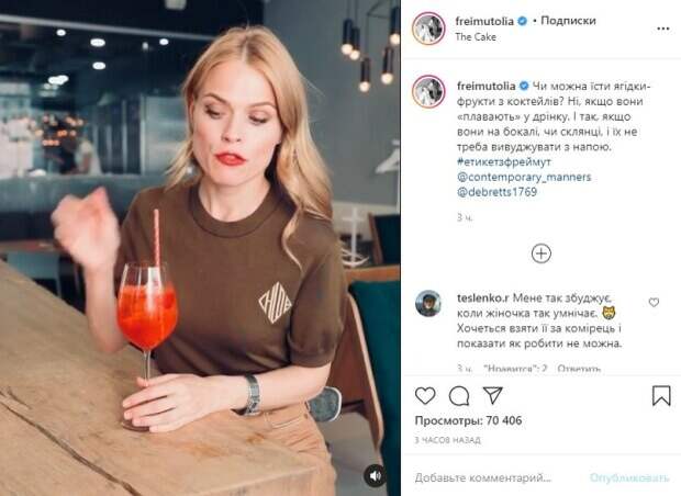 По ее словам, существуют определенные правила этикета, которых следует придерживаться. "Можно ли есть ягоды-фрукты из коктейлей? Нет, если они "плавают" в дринке. И да, если они на бокале или стакане, и их не надо выуживать из напитка", – поделилась информацией телеведущая. Посмотреть эту публикацию в Instagram Публикация от FreimutOlia (@freimutolia) 19 Окт 2020 в 1:29 PDT Фанаты поблагодарили Ольгу за ценный совет, заодно отметив цветущий вид и стильный образ своей любимицы. "Так збуджує, коли жіночка так умнічає.