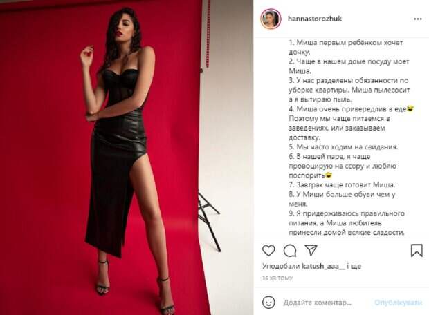 На новом снимке Анна запечатлена в фотостудии на красном фоне и в модельной позе. Перед камерой она появилась в узком кожаном платье черного цвета с пикантным разрезом на ноге. Этот наряд идеально сел по фигуре, подчеркивая все достоинства и выпирающий бюст. Волосы девушки распущены и небрежно уложены, а на ее лице яркий макияж. В подписи к кадру Богдан написала: "Я не очень часто рассказываю подробности о нашей жизни с Мишей! Надо исправляться. Решила, что будет интересно, насколько легко вы угадаете 3 не верных факта о нашей паре. Пишите в комментариях свои варианты: 1. Миша первым ребёнком хочет дочку. 2. Чаще в нашем доме посуду моет Миша. 3. У нас разделены обязанности по уборке квартиры. Миша пылесосит, а я вытираю пыль. 4. Миша очень привередлив в еде. Поэтому мы чаще питаемся в заведениях, или заказываем доставку. 5. Мы часто ходим на свидания. 6. В нашей паре, я чаще провоцирую на ссору и люблю поспорить. 7. Завтрак чаще готовит Миша. 8. У Миши больше обуви чем у меня. 9. Я придерживаюсь правильного питания, а Миша любитель принесли домой всякие сладости, чем часто провоцирует меня нарушить свой режим. 10. Миша может очень сильно залипнуть в телефоне. И меня это часто очень раздражает. Ну как? Есть варианты какие факты истинные, а какие - ложь?". Напомним, Заливако случайно "проговорился", остался ли он после "Холостяка" с Анной Богдан: "Жаль вас...". Как сообщала Politeka, "Холостяк" Заливако после критики украинцев решил признаться: "Выбирал же по факту не я...". Также Politeka писала, Юлия Зайка из "Холостяка" в свадебном платье поразила кадрами у моря: "Кольцо на безымянном пальце".