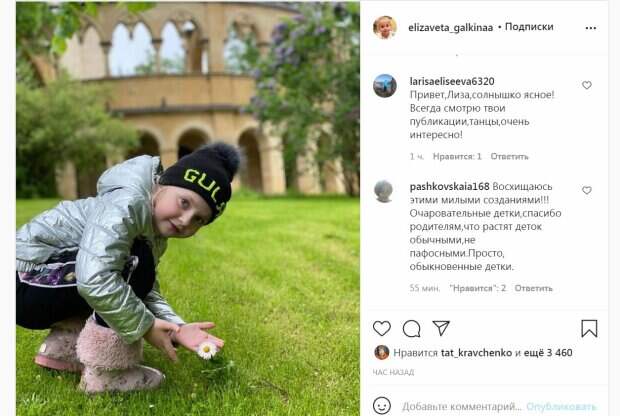 У деток сразу же появились поклонники, которые создают страницы в Инстаграм. Так, в одном из таких аккаунтов опубликовали фото дочери Галкина и Пугачеовой. Модная девочка позировала на зеленом газоне. Малышка была в серебристой куртке, черных лосинах и розовых сапожках. Голову прикрыла черная шапочка. Лиза смотрела в камеру, придерживая красивую ромашку. "Всем привет ))", - написали авторы поста. За час публикация собрала более 3000 лайков и много комментариев. "Красавица", "ЛИЗОЧЕК нашла ЦВЕТОЧЕК!!!