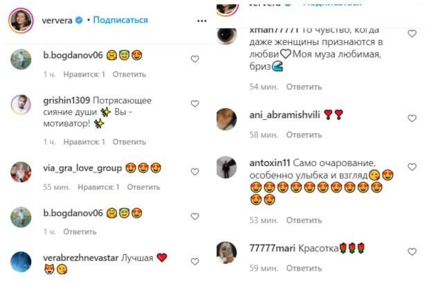 Домашний лук Брежневой составили брюки клеш из мягкой трикотажной ткани в рубчик, которые она дополнила бежевым свитером с V-образным вырезом, украшенным полосочками. К наряду певица подобрала белую футболку, которая подходят по цвету к общему наряду, а вот макияж Вера решила сделать сдержанный, едва заметный. Выглядела супруга Константина Меладзе просто превосходно и роскошно, хоть и была одета лишь в домашнюю мешковатую одежду! "На работе вы меня видите и знаете, я могу быть разной, а вот дома я - домашняя