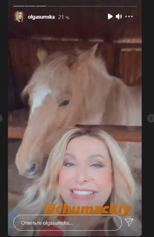 "Ну, как это мы в "Чумацькому Шляху" и не заглянем к прекрасным лошадкам", - сообщила актриса. Сумская сразу же выбрала себе фаворита - поджарого коня светло-коричневого цвета. "Вот он, мой любимец... Мой красавчик! Привет, мой хороший", - ласково заговорила с ним она. Конь сначала заинтересовался, кто это к нему подошел, а потом неожиданно оттолкнул Ольгу. "Ой, боже! Видишь, оттолкнул меня", - пожаловалась та и состроила недовльную гримасу. Следующий "любимец" оказался куда покладистей. "А вот это добрый конь, он не толкается. К нему можно подойти, погладить... просит у меня что-то вкусненькое", - приголубила его звезда. Ранее мы рассказывали, Сумская вызвала у публики восторг совместным фото с певцом Павлом Зибровым. С одной стороны он обнимал за талию Ольгу, а с другой - еще одну блондинку. Счастливая Сумская в длинном желтом платье с вышивкой растаяла в руках известного "усача", забыв о своем супруге Виталии Борисюке, ставшем новой звездой "Голоса країни". Напомним, что Ольга Сумская в лосинах показала их с Борисюком роскошную спальню, размеры впечатляют: "Радуюсь...". Как сообщала Politeka, Ольга Сумская похвасталась "ожившими" фото своего детства, как выглядела звезда: "Лялюня". Также Politeka писала, что Сумская поделилась простым рецептом очень необычных блинов: «Можно побаловать себя!».