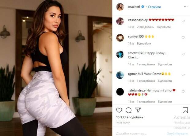 Она рассказала подписчикам о новых поступлениях спортивной одежды и предложила им ознакомиться с ним. Однако поклонники Чери больше обратили внимание на роскошный вид звезды, нежели на ее слова. «Горячая штучка», «идеальный ракурс», «вау, какое горячее тело», «красотка бомбезная», «девушка из моих снов», «ты очень милая», «Чери, ты супербомба», «божественно красива», «этот взгляд – просто улет», - пишут они. До этого мы писали, что известная фитнес-модель Ана Чери удивила смелым образом, показавшись на пляже. На фото Чери позирует в трусиках и топе со стразами, которые блестят. Образ красотка дополнила розовыми крыльями бабочки, а сама стояла на коленях, закрыв глаза от удовольствия. Девушка не стеснялась демонстрировать свою фигуру и даже немного выгнулась, чтобы продемонстрировать грудь, благодаря чему фото вышло максимально жарким. "Ты дашь мне бабочек", - написала красотка под фото. Напомним, Ана Чери не удержалась и показала, что прячет в мини-шортах А еще Politeka писала, что Ана Чери не удержалась и показала, что прячет в мини-шортах Также Politeka сообщала, что Ана Чери соблазнила пышными "булочками" в ниточках вместо бикини