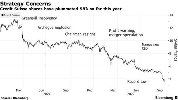 Акции, которые уже упали более чем вдвое в этом году до распродажи в понедельник, упали на 12% на торгах в Цюрихе до рекордно низкого уровня, при котором компания оценивается менее чем в 10 миллиардов долларов. Это сопровождалось скачком стоимости страхования долга банка от дефолта, который подскочил до самого высокого уровня за всю историю. Кернер, во второй раз за несколько недель, попытался успокоить сотрудников и рынки, опубликовав вечером в пятницу служебную записку, в которой подчеркивалась ликвидность банка и сила капитала. Вместо этого он сосредоточил внимание на драматических недавних изменениях в цене акций фирмы и кредитных спредах, и инвесторы поспешили выйти, когда торги возобновились после выходных. Признавая, что банк находится в «критическом моменте», Кернер пообещал регулярно рассылать сотрудникам обновления до тех пор, пока фирма не объявит о своем новом стратегическом плане 27 октября. В то же время Credit Suisse снова разослал тезисы для руководителей, работающих с клиентами кто упомянул своп кредитного дефолта, по словам людей, осведомленных в этом вопросе. «Credit Suisse — это покупка для смелых на этих уровнях», — написали аналитики Citigroup, включая Эндрю Кумбса, в записке для инвесторов. «Но поток заголовков новостей, вероятно, останется негативным…». Внимательно отслеживаемый показатель кредитного риска для банка находится на рекордно высоком уровне , даже после того, как его главный исполнительный директор Ульрих Кернер попытался успокоить сотрудников на выходных. Обнадеживающее слово появилось раньше, чем стратегический план Credit Suisse по возможным продажам активов и бизнеса, который будет обнародован в конце октября. По мнению аналитиков Citi, причины для осторожности остаются. «Мы видим значительный риск исполнения любого нового стратегического плана», — написал Эндрю Кумбс, который является одним из четырех аналитиков с рекомендацией «покупать» акции. Согласно данным Bloomberg , еще 15 других компаний держат акции и девять продают . Хотя они все еще далеки от бедственного положения, а также являются частью широкой рыночной распродажи, они означают ухудшение восприятия кредитоспособности пострадавшего от скандала банка в текущих условиях. Теперь свопы оцениваются с вероятностью примерно 23%, что банк не выполнит свои обязательства по своим облигациям в течение 5 лет. Некоторые клиенты использовали рост CDS в этом году, чтобы задавать вопросы, договариваться о ценах или использовать конкурентов. Credit Suisse отказался от комментариев через представителя компании. Тем не менее, некоторые видные деятели обратились в Твиттер на выходных, чтобы опровергнуть некоторые слухи, циркулирующие в социальных сетях, вызванные расширенным распространением CDS, как «нагнетание паники». Боаз Вайнштейн из Saba Capital Management написал в Твиттере «сделай глубокий вдох» и сравнил ситуацию с ситуацией, когда CDS Morgan Stanley был вдвое шире в 2011 и 2012 годах. Кернеру, назначенному генеральным директором в конце июля, пришлось столкнуться с рыночными спекуляциями, увольнениями банкиров и сомнениями в отношении капитала, поскольку он стремится проложить путь вперед для проблемного кредитора, который пострадал от череды финансовых и репутационных ударов. По сообщению Bloomberg, в настоящее время кредитор завершает разработку планов, которые, вероятно, при