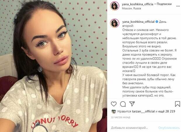 Позже артистка рассказала о своем состоянии в Инстаграм. По словам Кошкиной, на второй день у нее нет ни отеков, ни синяков, однако есть дискомфорт и небольшая припухлость в той десне, которую больше всего резали. "У меня высокий болевой порог. Как говорила ранее, зубы обычно лечу без анестезии. Мне удаляли зубы под седацией, поэтому самое больное, что было - установка катетора