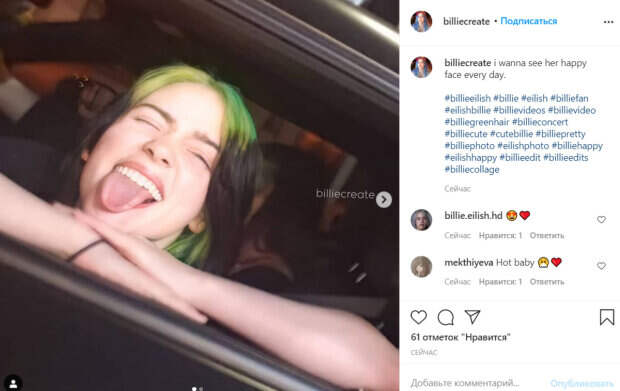 Зеленоволосая красотка решила немного побаловаться и показала язык своим поклонникам. Выглядела девушка дерзко и очень привлекательно. «Я хочу видеть ее счастливое лицо каждый день», - подписали фото авторы аккаунта. «Горячая детка», - коротко прокомментировали пост поклонники. Как известно, Билли Айлиш стала широко известной только в 2016 году, но уже успела прославиться на весь мир. Своенравная певица известна своей искренностью и простотой. В 2020 году Билли стала настоящим триумфатором года, собрав все главные награды премии Грэмми. Ее песни и альбом были признаны лучшими, а саму певицу признали настоящим открытием. Ранее мы писали, что Билли Айлиш засветилась рядом со знаменитым красавчиком, исполнителем Джастином Бибером. Парочку сняли вместе на публичном мероприятии. Звезды не скрывали улыбки, тесно прижавшись друг к другу. Напомним, что дерзкая Билли Айлиш отбросила стыд, отшлепав себя прямо перед камерой: "ни капли стеснения". Как сообщала Politeka, Билли Айлиш отбросила стыд, засветив фигуру в открытом бикини: "Чертовски хороша!". Также Politeka писала, что Билли Айлиш разорвала на себе футболку, разбередив самые смелые фантазии: "Остановитесь...".