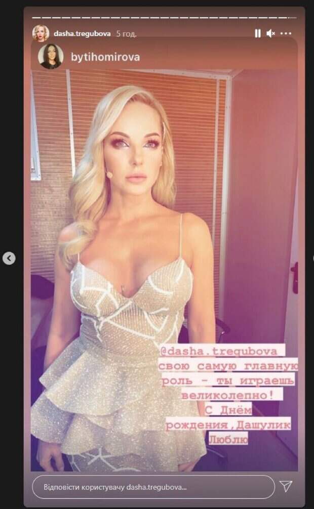 В этот раз Даша показалась в блестящем платье с большим декольте и безе белья. Трегубову совсем не смущал ее образ, поэтому красотка с удовольствием демонстрировала пышные формы. "Свою главную роль ты играешь великолепно. С Днем рождения, Дашулик. Люблю", - написано было под фото. Фанаты не смогли оценить такой роскошный образ Трегубовой, ведь кадр оказался в сторис Инстаграм, где подобных функций нет, но т ак и хочется добавить: "Ооо, да!". Мы писали, что украинская телеведущая и актриса Даша Трегубова поделилась новым снимком в соблазнительном образе. Трегубова поделилась чувственным фото, на котором позирует на стуле у окна. На ведущую падают тени, поэтому проглядывается только ее силуэт. Судя по нему, Трегубова одета в соблазнительный боди со стильным узором. Напомним, Трегубова из "Х-Фактора" без стыда и белья заставила любоваться своей красотой А еще Politeka писала, что искусительная Трегубова из "Х-фактора" сверкнула прелестями в прозрачной кофточке Также Politeka сообщала, что подвыпившая Трегубова из "Х-Фактора" позволила заглянуть в свое декольте