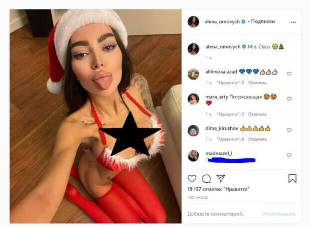 Алена высунула язык и совсем не стеснялась хвастаться бюстом. Об этом пишет Politeka.net со ссылкой на страничку знаменитости. "Миссис Клаус", - подписала звезда фото. Фанаты поставили почти 20 тысяч лайков и написали комментарии: "потрясающая", "Невероятная внешность, мечта", "Господи, как вы их носите! ", "Пусть это будет рождественская мама, как ты, я ношу маску каждый новый год на улице", "И тебя с новым годом", "Девушка Бонда. Самая красивая из всех", "Какая же ты устрица блин с мячиками...", "Судя по такой жесткости, тебе нравится", "Мне кажется одной или зрачки разные?". Мы писали, что модель Алена Омович устроила провокационную съемку в новом наряде. Девушка на новом фото смогла удачно выставить на обозрение публики свои достоинства. Благодаря тонкой сеточке в зоне декольте Алена подчеркнула формы и также показала их размеры без лифчика – довольно глубокий вырез едва прикрыл самое главное. Напомним, украинская Кардашьян сразила размерами бюста в белье из одних полосочек Также Politeka писала, что украинская Кардашьян затмила раскрепощенных подружек бюстом шестого размера А еще Politeka сообщала, что украинская Кардашьян взбудоражила видом в платье со стяжками на пикантных местах
